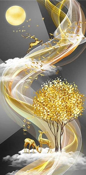 - Golden Abstract Diamond Painting - Scenic Deer Under Tree And Moon, Full Square/Round 5D Diamonds