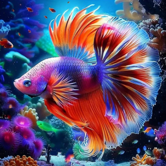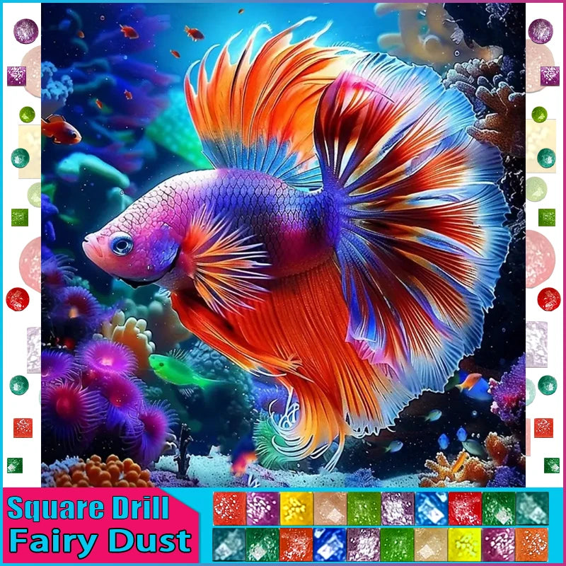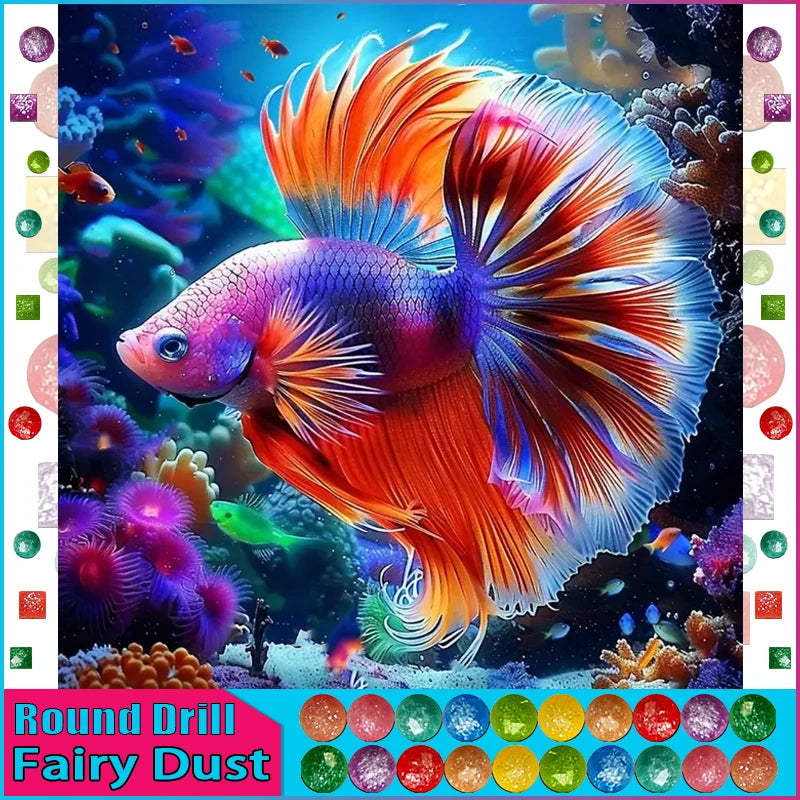 Fancy Neon Goldfish Set Against A Colorful Coral Background - You Have A Choice Between The Glimmer Of Aurora Borealis Square/Round Diamonds Or The Sparkle Of Fairy Dust Round/Square Diamonds - This DIY Abstract Diamond Painting Is An Eye Catcher That Is Both Fun And Relaxing To Create - Add This To Your Diamond Art Collection Today! Remember...The Larger The Canvas The Greater The Detail In The Finished Product!