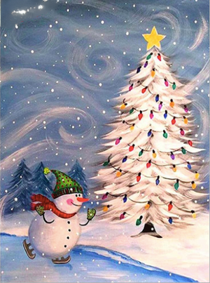 Cute Snowman Skating Around A Bright Snow Covered Christmas Tree - This Beautiful Christmas Diamond Painting Kit Come In Full Round Or Full Square Drill Rhinestones Available In Several Canvas Sizes - This A Festive Holiday Design That Brings The Fun Of The Christmas Spirit!