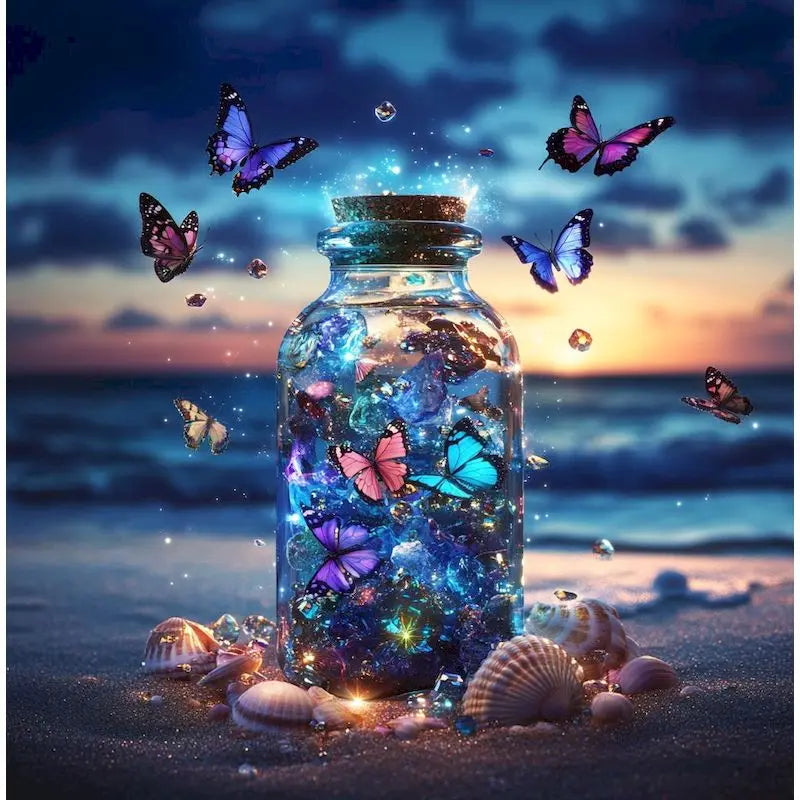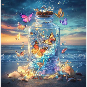 Beautiful Ocean Design Featuring A Clear Glass Jar In The Sand Surrounded By Shells And Butterflies - Full Square/Round Drill 5D Diamonds - Full Pasting Area In Several Canvas Sizes - This DIY Scenic Diamond Painting Will Bring The Beauty Of The Sea Into Any Room! Choose Your Favorite Of 2 Designs!