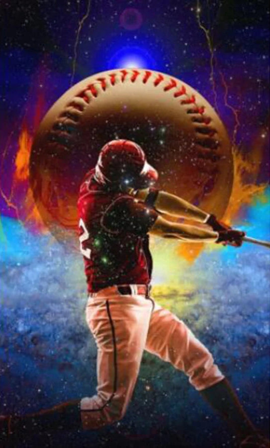 Colorful Action Shot Of Baseball Player In Full Swing With A Large Baseball As The Background - Full Square/Round Drill 5D Diamonds - Full Pasting Area In Several Canvas Sizes - This DIY Sports Diamond Painting