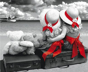 - Black, White, Red "Two Children Set Sail" 5D Diamond Painting Kit