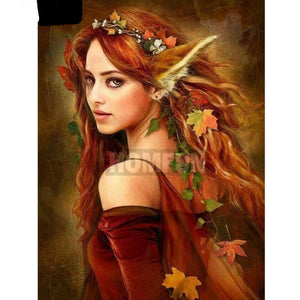 Fantasy Diamond Painting Fans Will Really Fall For This Red Hair Girl Elf Diamond Painting - This Elf Woman Could Be Out For A Stroll In The Autumn Woods As She Turns To Look Back With Leaves Gently Falling Around Her - Full Round Full Square 5D Diamonds On Full Pasting Area