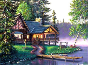 What A Beautiful Forest Refuge With A Beautiful Cabin Resting Among The Pines By A Calm Lake - Scenic Rhinestone Embroidery Full Square / Round Drill 5D Diamonds - DIY Scenic Diamond Painting Displaying Amazing Home And Water View Scenery - Available On Full Pasting Area In Several Painting Canvas Sizes - DIY Diamond Kit - Perfect For Any Home Or Office Decor